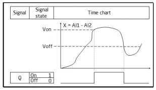 Két analóg jelet köthetünk be a blokk Al1 és Al2 bemenetére. Ha a két bemenet eltérése több vagy egyenlő, mint a beállított Von paraméter értéke, akkor a Q kimenet bekapcsol és úgy is marad, míg a két bemenet eltérése kevesebb vagy egyenlő nem lesz a Voff paraméter értékével.