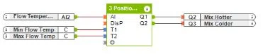 Ebben a példában van egy két bemenetes keverő szelep, amit két digitális kimenettel szabályozunk, egyet a teljes nyitásra, és egyet a teljes zárásra.