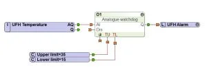 A következő példában egy padlófűtési kör hőmérsékletét akarjuk figyelni. Amikor a hőmérséklet túl magasra megy, a padlókárosodást szenvedhet el. Megjegyzés: ez csak telefonhívás vagy e-mail értesítés. Mindig kell lennie egy termosztátnak a padlóban, amit nem szabályoz a Loxone, ami megállítja a fűtést, ha az túlfűtene, vagy állítsuk be kézzel a hőmérsékleteket a termosztáton.