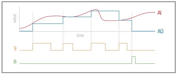 Egy felfutó él a Tr (Set) bemeneten eltárolja az AI (V) bemeneten lévő analóg értéket az AQ (V)kimenetre.