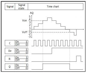 A számláló kimenete az AQ (V), amely minden C bemenetre érkező impulzus hatására, egyet hozzá ad vagy elvesz a Dir bemenet értékéhez. Az SV paraméter segítségével megadhatjuk az AQ (V) kezdeti értékét.