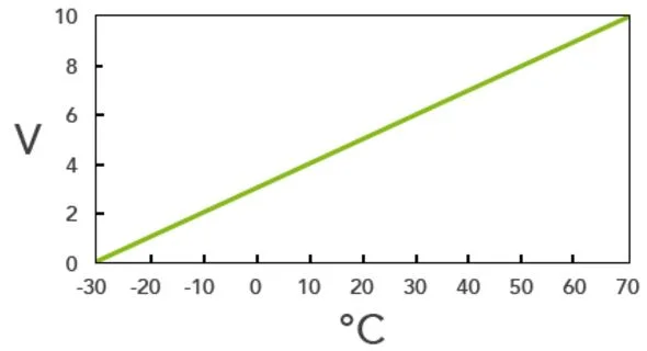 Egy 0-10V-os bemeneti jelet alakít át -30 és 70 °C közé. A paramétereknek a következőképpen kell beállítva lenni: